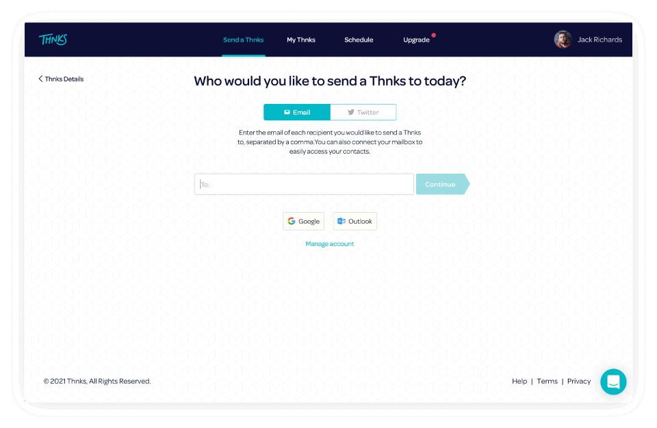 Choose best way to say Thnks (email, sms, social). Recipient won’t need an account to redeem Thnks.